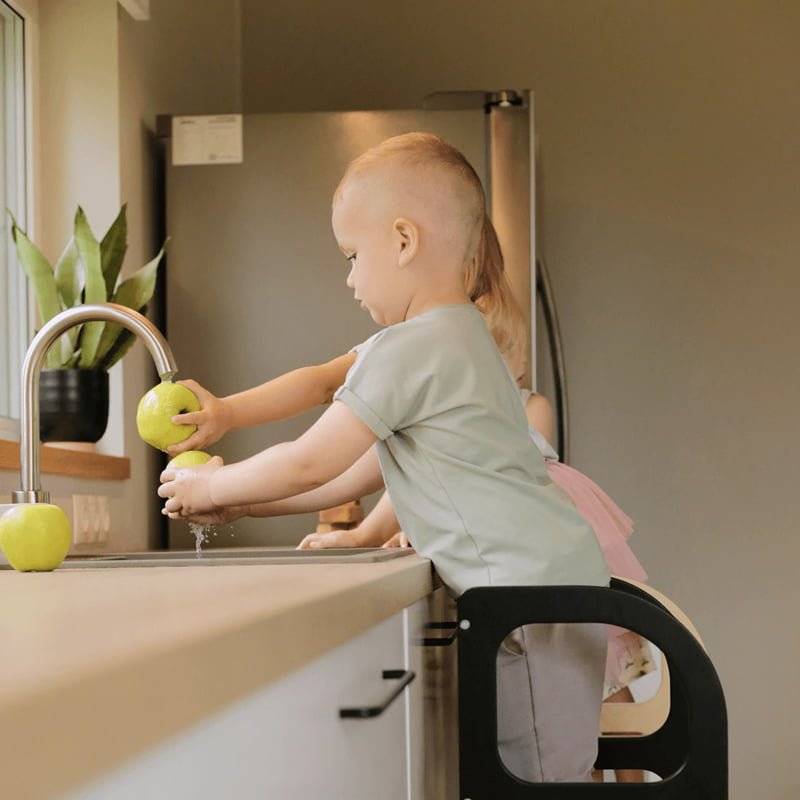 Independence remains at the heart of Montessori philosophy. A kitchen helper tower, for example, enables a child to safely participate in everyday household activities such as cooking, strengthening their confidence and practical life skills.