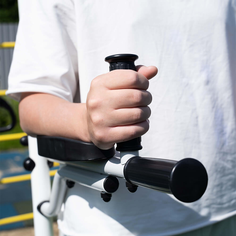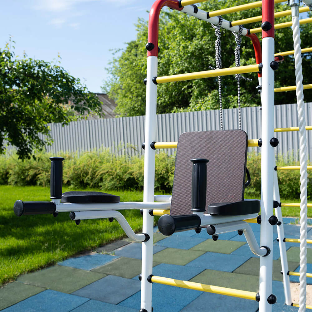 Certified metal dip bars with backrest for kids and adults can be hanging on a metal outdoor playground. Sport accessories allow expanding training exercise, which you can do at outdoor sport set. Dip bars can be a brilliant way to incorporate compound exercise into your workout.