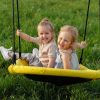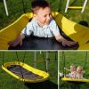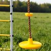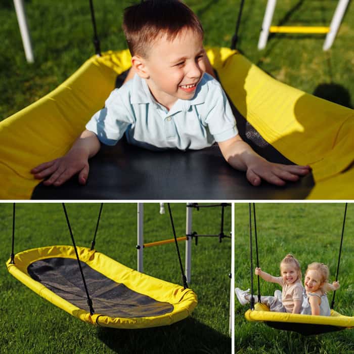 The modern garden swing is made of steel. The powder coating makes the robust construction weatherproof. Also it is a good protection against rusting. Unlike wooden playgrounds, metal ones do not need impregnation to protect them from rotting. The children’s hanging accessories also have enhanced weather resistance. Therefore, they can remain mounted at all times during the summer. Product quality confirmed by certification. The swings can be easily dismantled and temporarily replaced by other gymnastic accessories to add variety to the play.