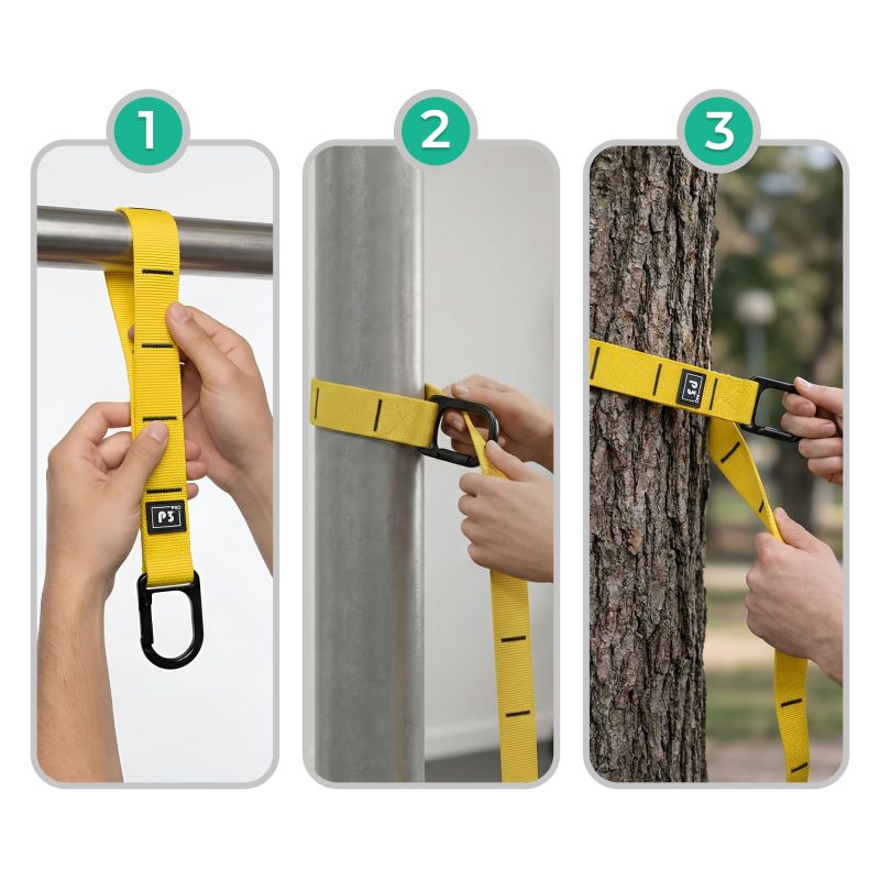 The training straps can be easily attached to a sturdy tree in the garden, a metal pole, a pull-up bar, or a closed door at home. Thanks to the specially designed mounting system, setup is quick and requires no additional tools. This practical solution allows you to train safely and comfortably, whether outdoors or indoors, giving you the freedom to exercise wherever you like.