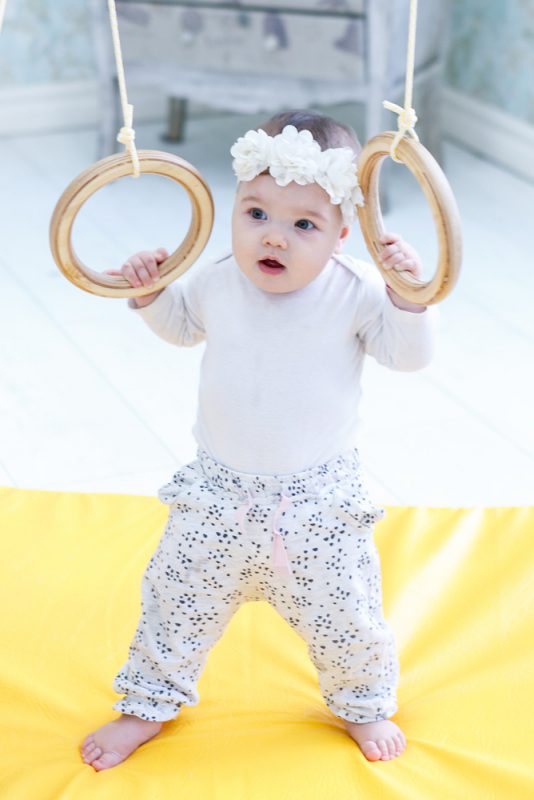 From as early as 3 months, you can place your child in a sports set on a gym mattress and hang the wheels at a distance suitable for your child’s arms. Carefully put the rings in the little one’s hands. Gradually, the child will start either pulling the wheels together or dragging itself to them. Hang a bell on one of the rings: the child will be interested in the sound and will grasp the ring.