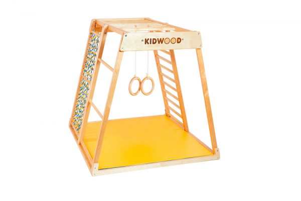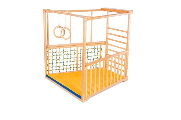 As soon as your child starts standing on their feet while holding on to something, encourage them to use the gymnastic rings or wooden gym wheels as resistance. Adjust the height based on your child’s size. You can hang the rings at different heights to add variety and fun to the home playground.