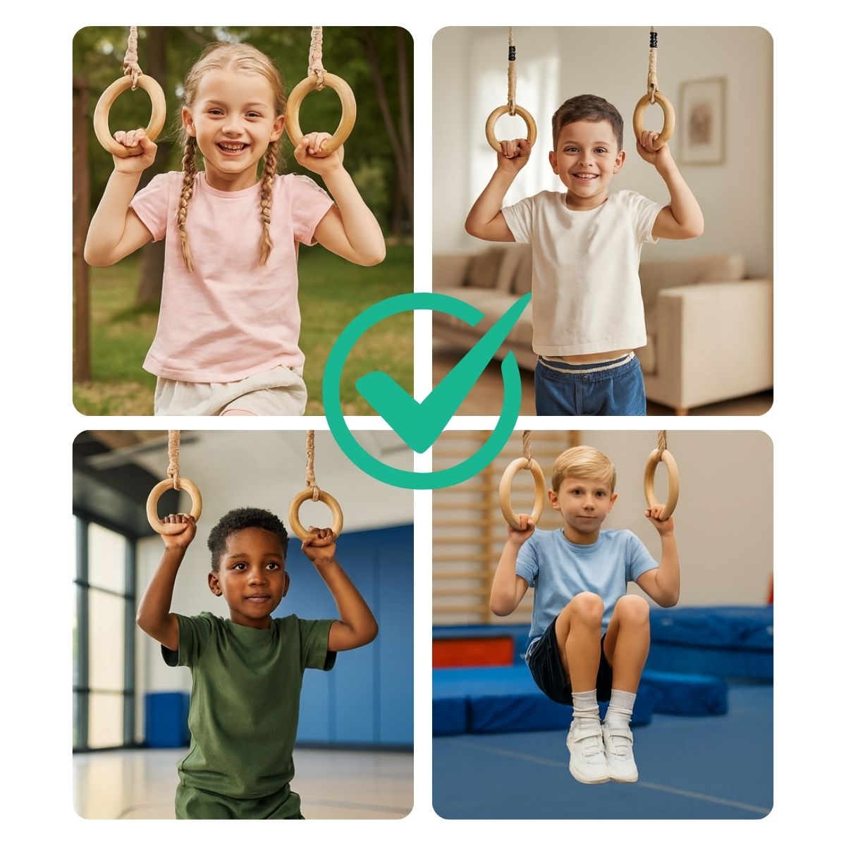Wooden gymnastic rings are one of the most popular exercise and play devices for children. The rings are suitable for both indoor and outdoor play thanks to their durability and resistance to weather conditions. They can be mounted on various playground structures and home gyms.
