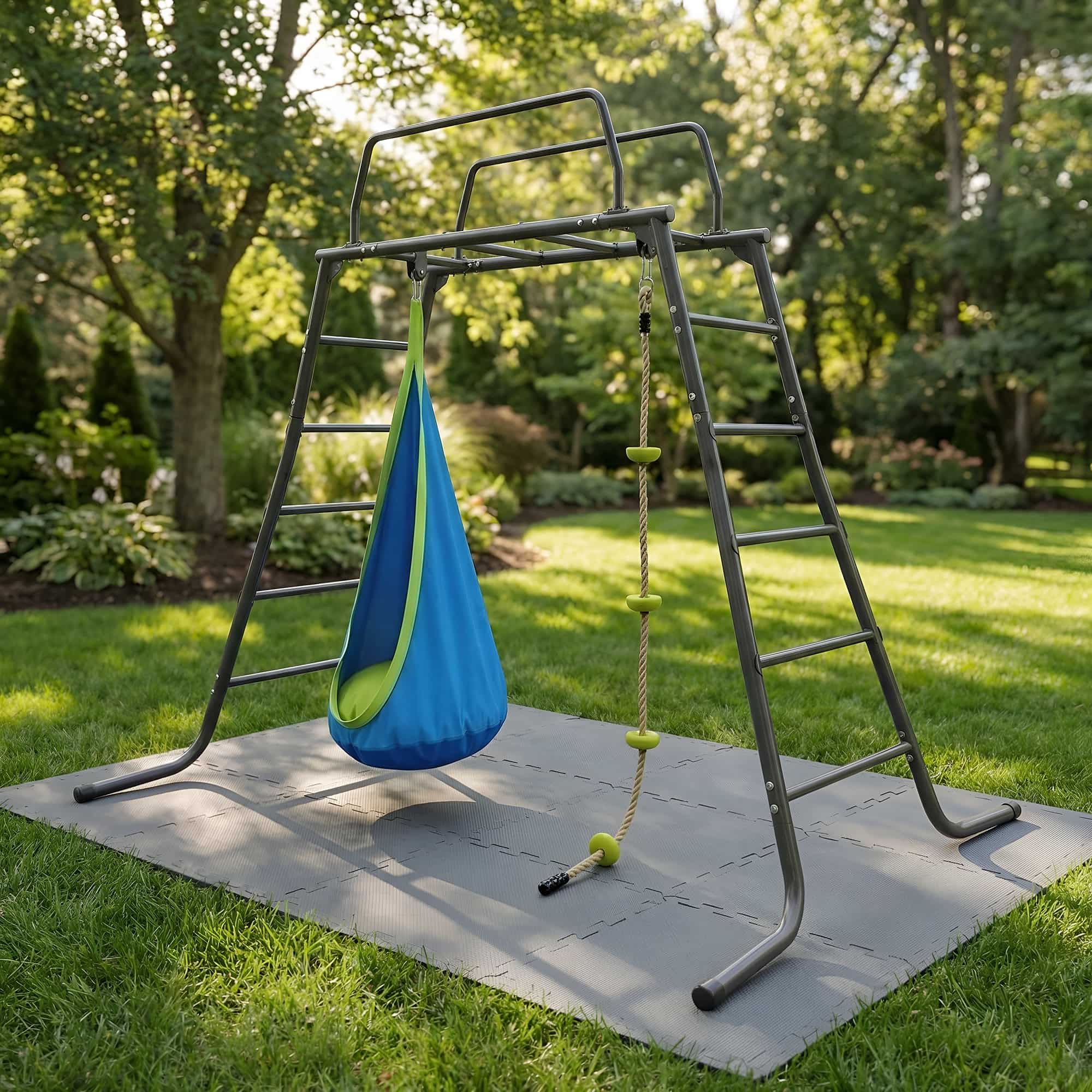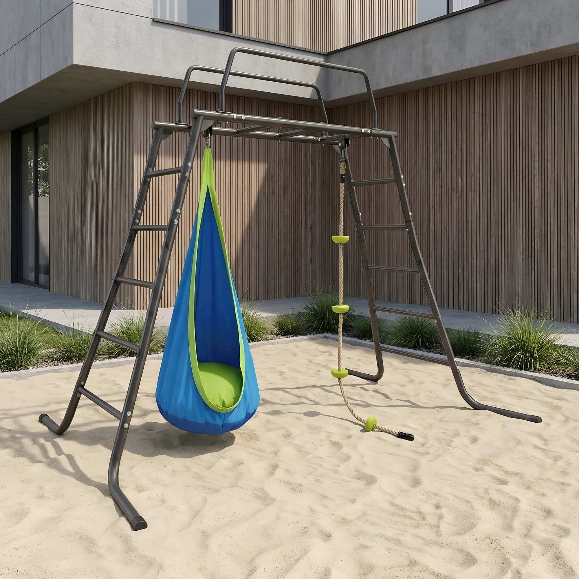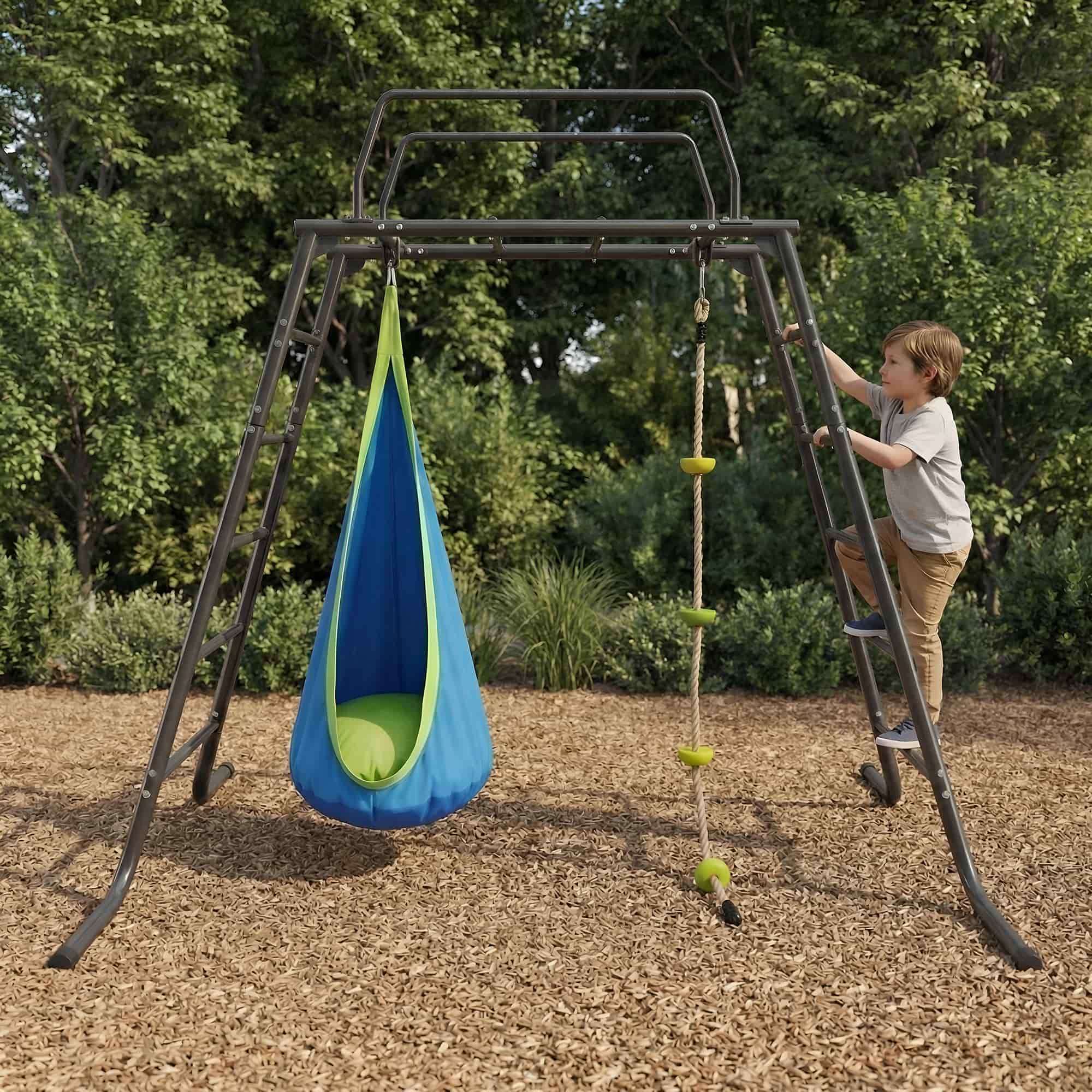 Garden Climbing Frames “M-Bars Kids” with Hanging Cocoon Chair and Gym Climbing Rope — from Monkey-gym, made for joyful growth 🐒💚