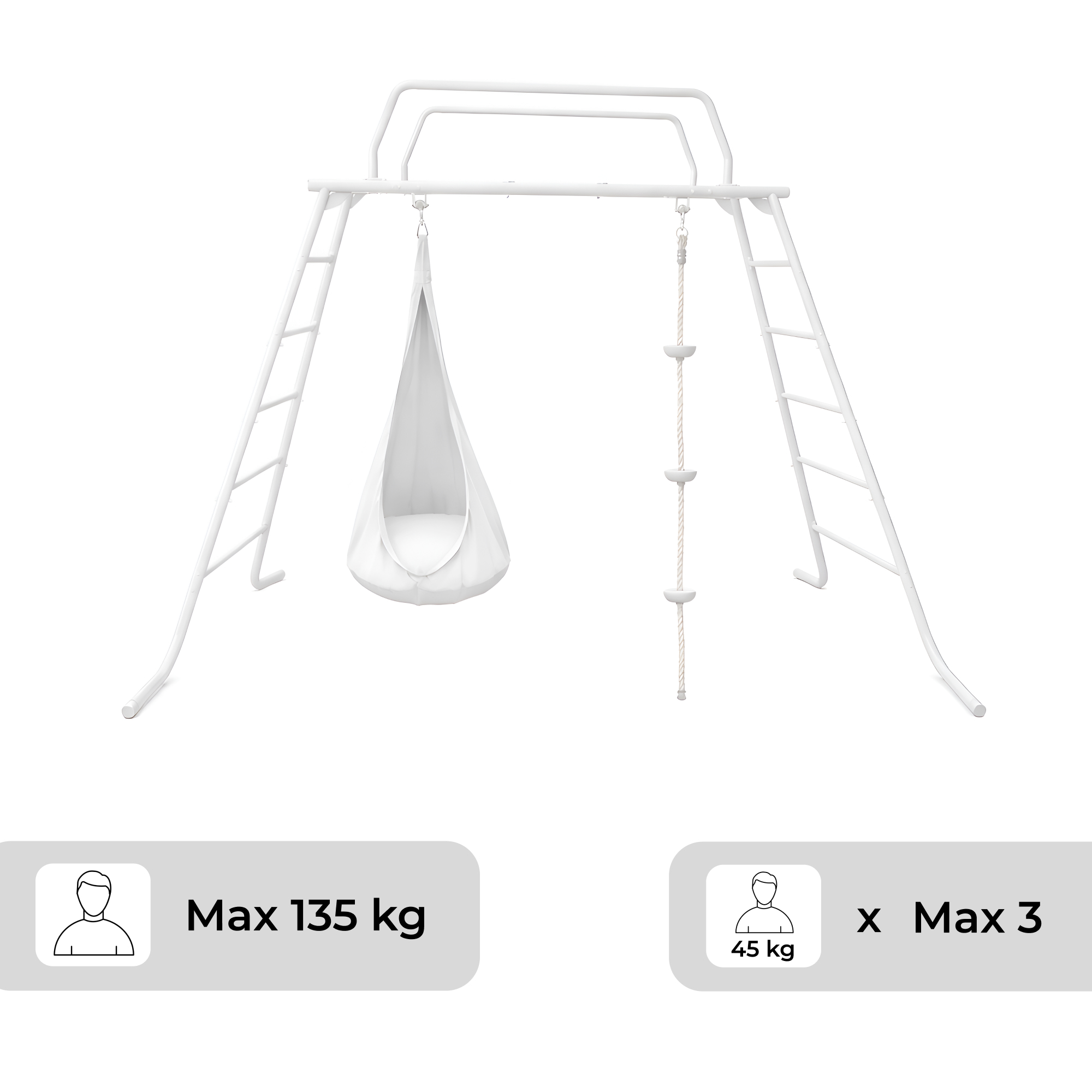 This children’s climbing frame combines active play and cozy rest in one beautifully balanced design. The metal climbing frame structure supports a hanging cocoon chair — a soft, protected nest where little ones can relax after play — and a gym climbing rope with foot supports, perfect for building coordination, strength, and balance. One moment they’re climbing high, reaching new goals — the next, they’re swinging gently, feeling calm and proud.💪 Set components: