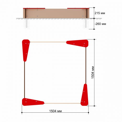 sandbox with dimensions 150 x 150 cm made of plywood, with seats located in the corners. Sand in the sandbox should be protected from any kind of contamination and from animals. The frequency of sand exchange depends on the possibility of covering the sandbox.