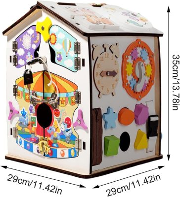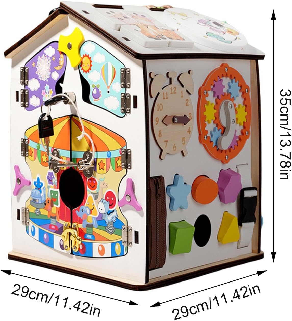 The Busy Board House invites children into familiar, real-life experiences: opening doors, turning keys, sliding locks, switching lights. All these simple actions help develop coordination, independence, and understanding of cause and effect — in a way that feels natural and joyful.