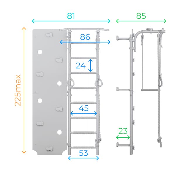 - Мax. load: 100 kg (wall bars and pull-up bars), 50 kg (additional accessories)