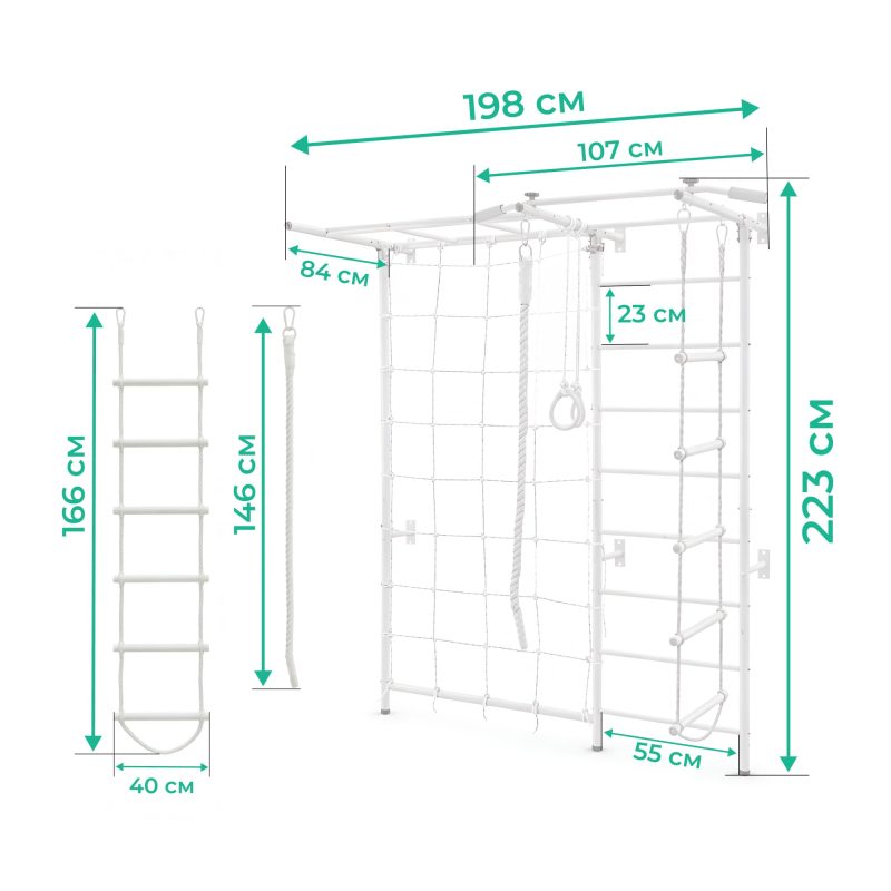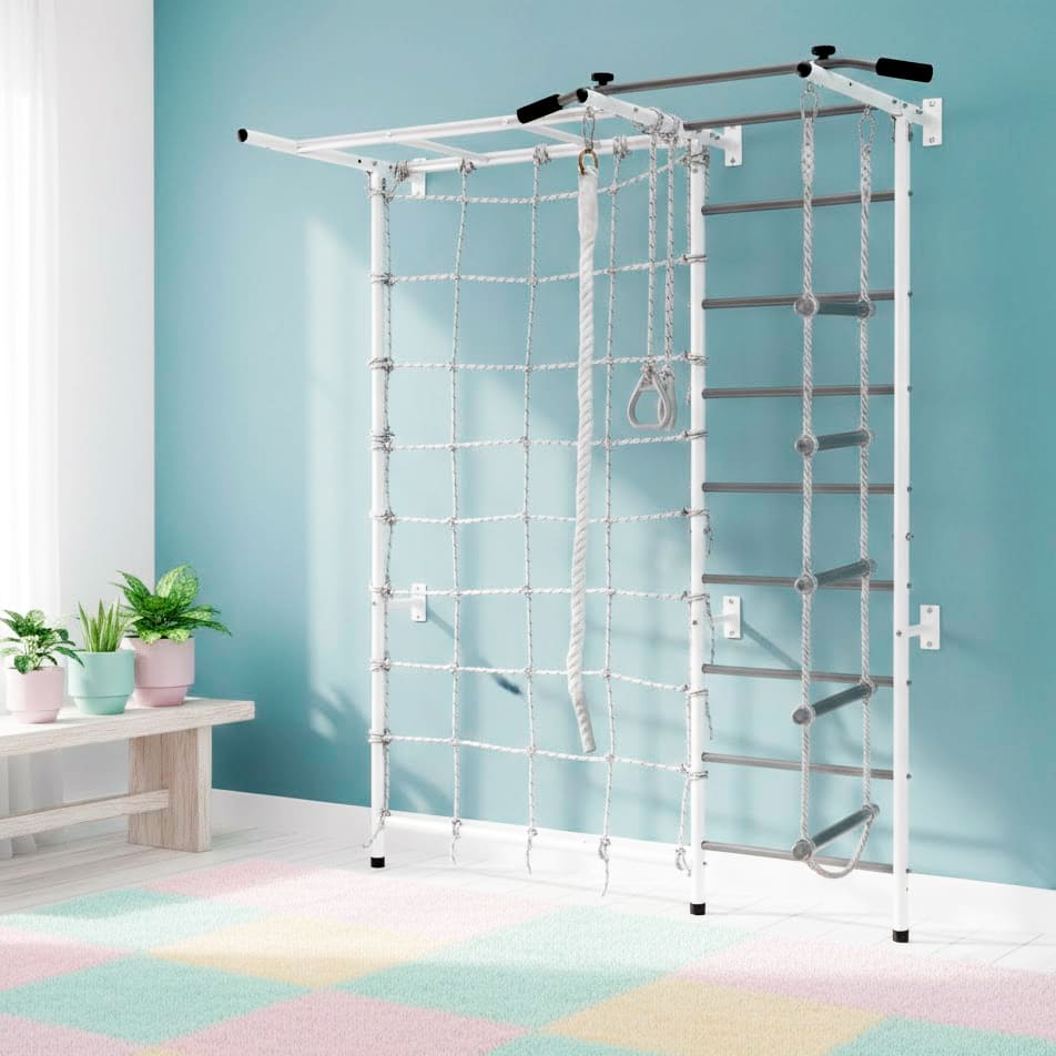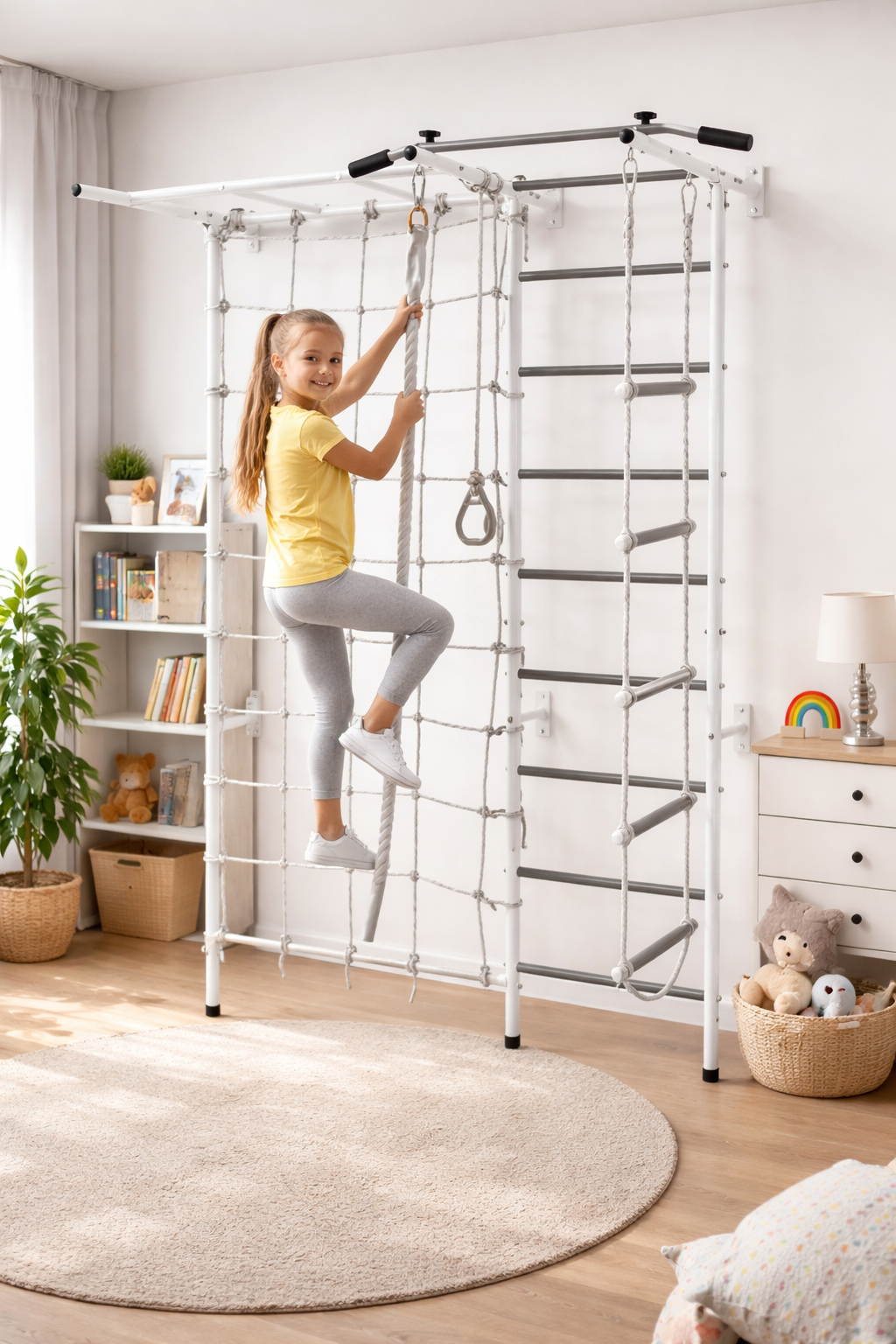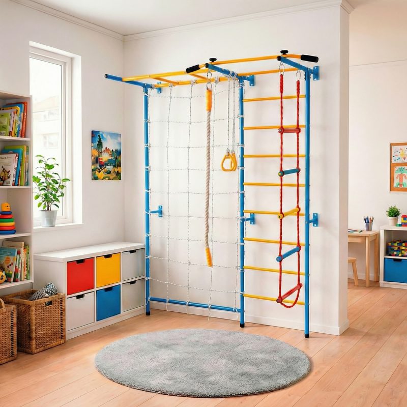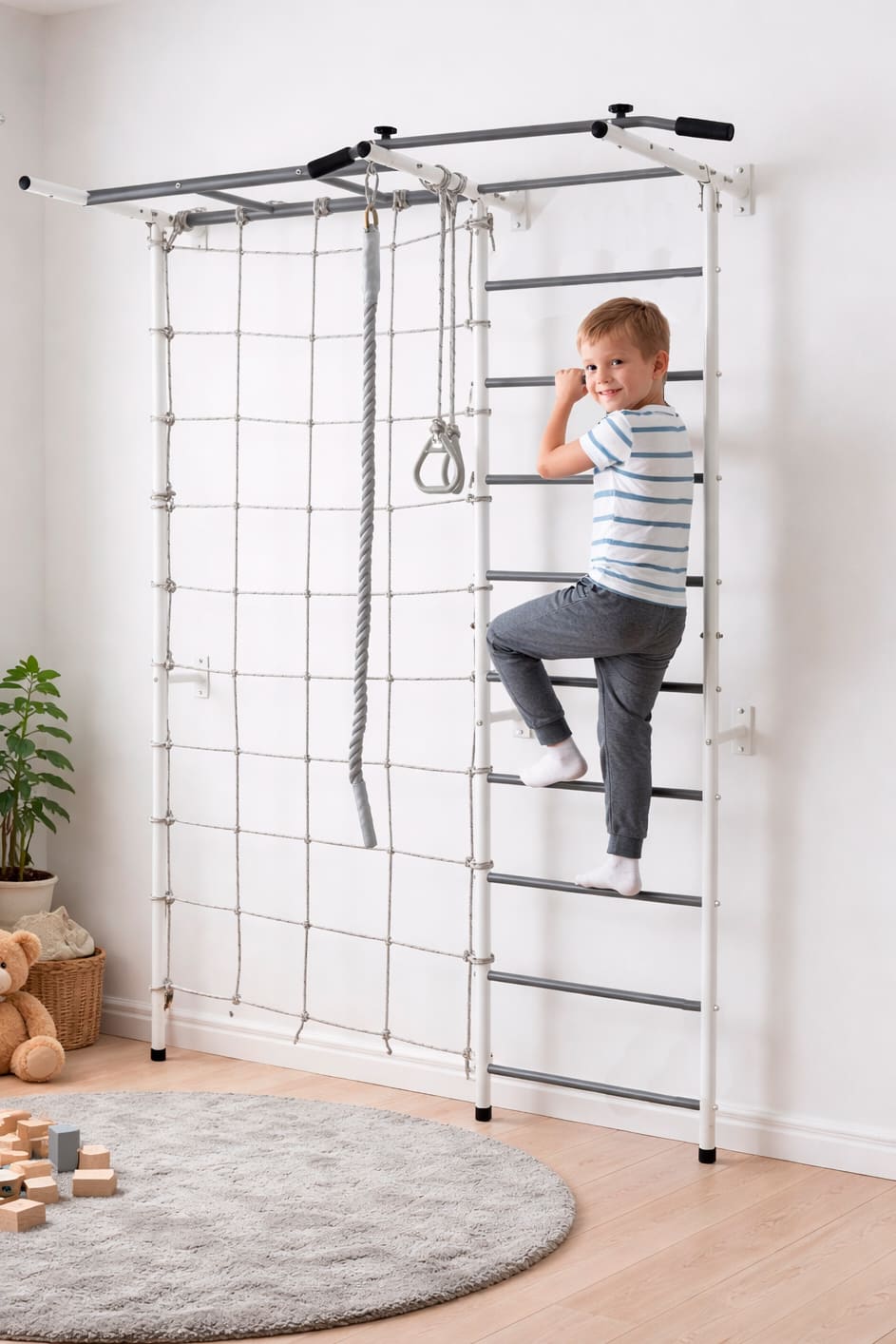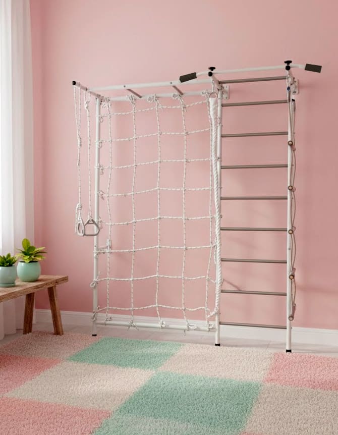The wall bars can be easily enhanced with a variety of additional accessories to make exercise and play even more fun. You can attach a trapeze, a cocoon-style swing, or a disc swing, providing children with new ways to climb, balance, and develop their coordination. These accessories make the setup more versatile and engaging, perfect for both fitness and creative play.
