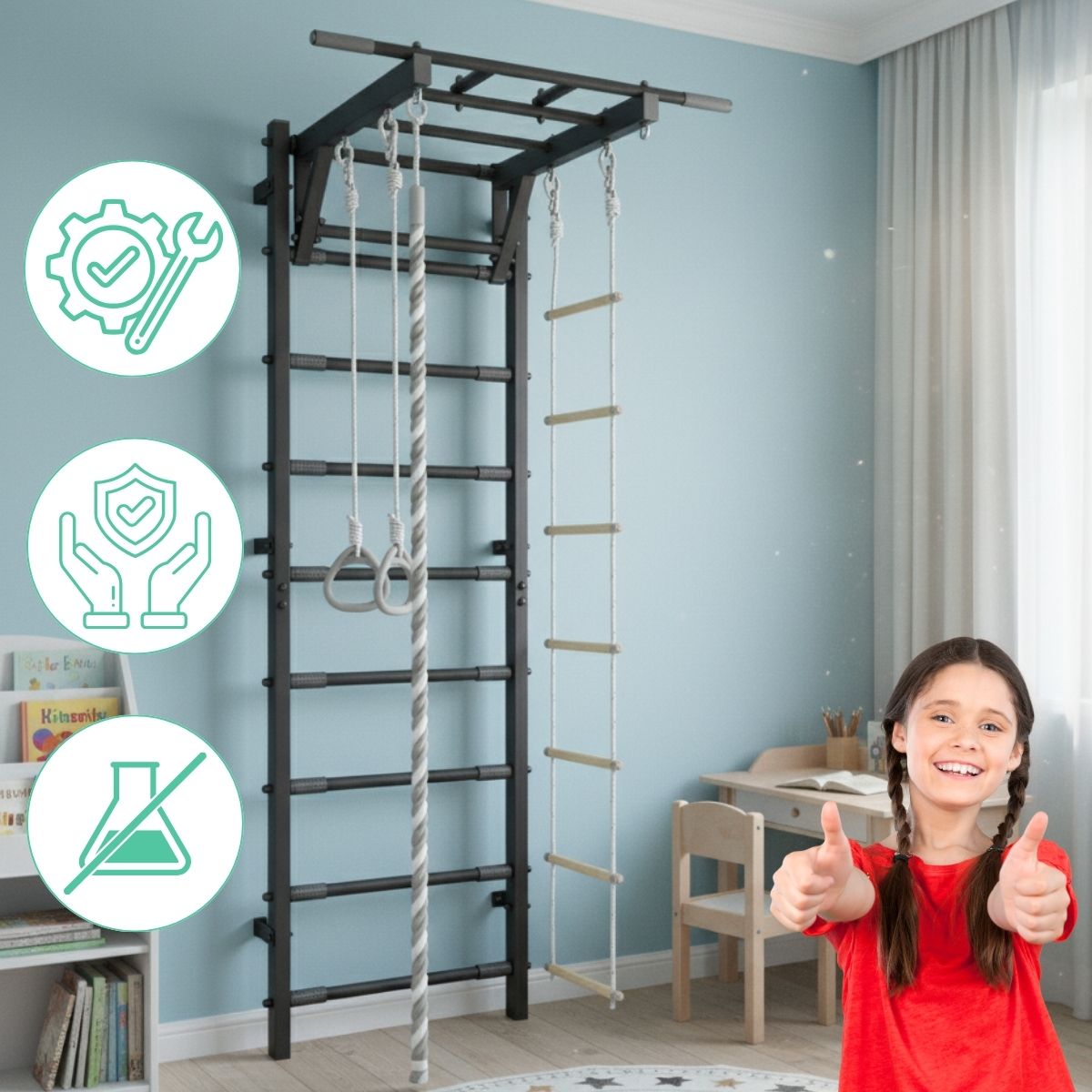 Our Wall Bars Trick isn’t just a swedish wall ladder — it’s a space where strength, coordination, and imagination meet. Designed with love and attention to detail, the Trick wall bars bring together safety, durability, and versatility, turning any wall into a hub of activity and fun.