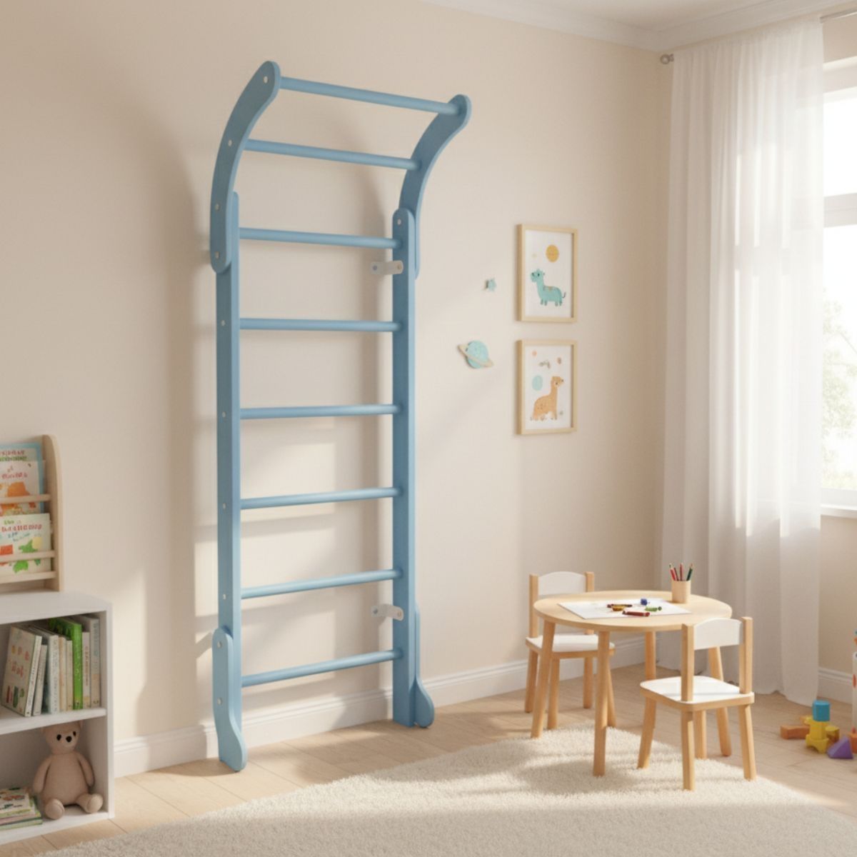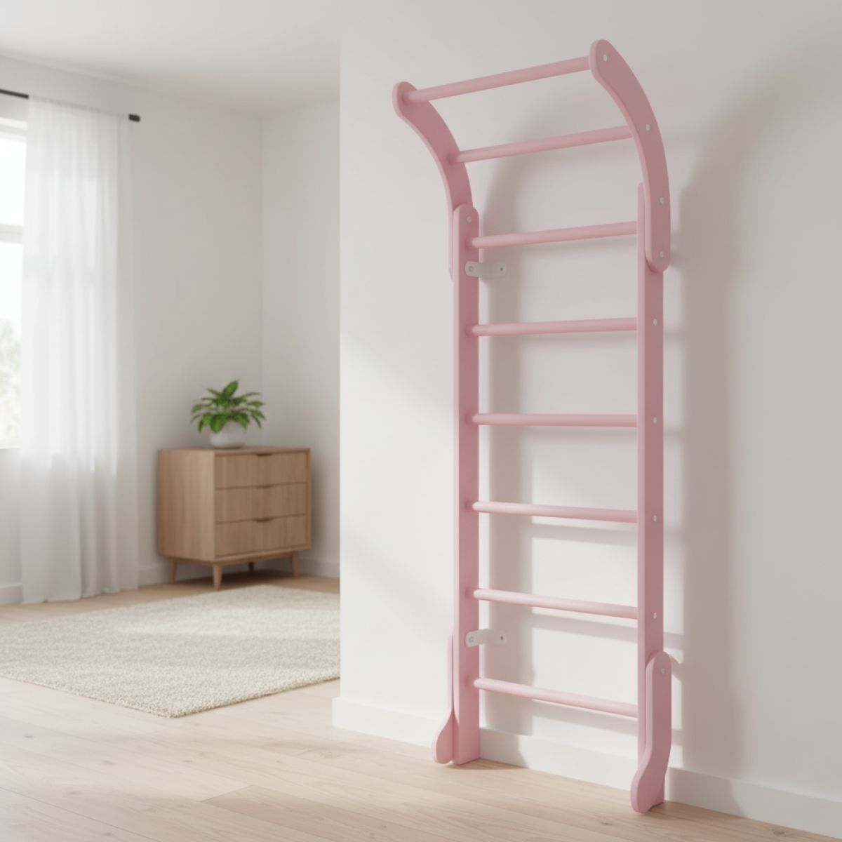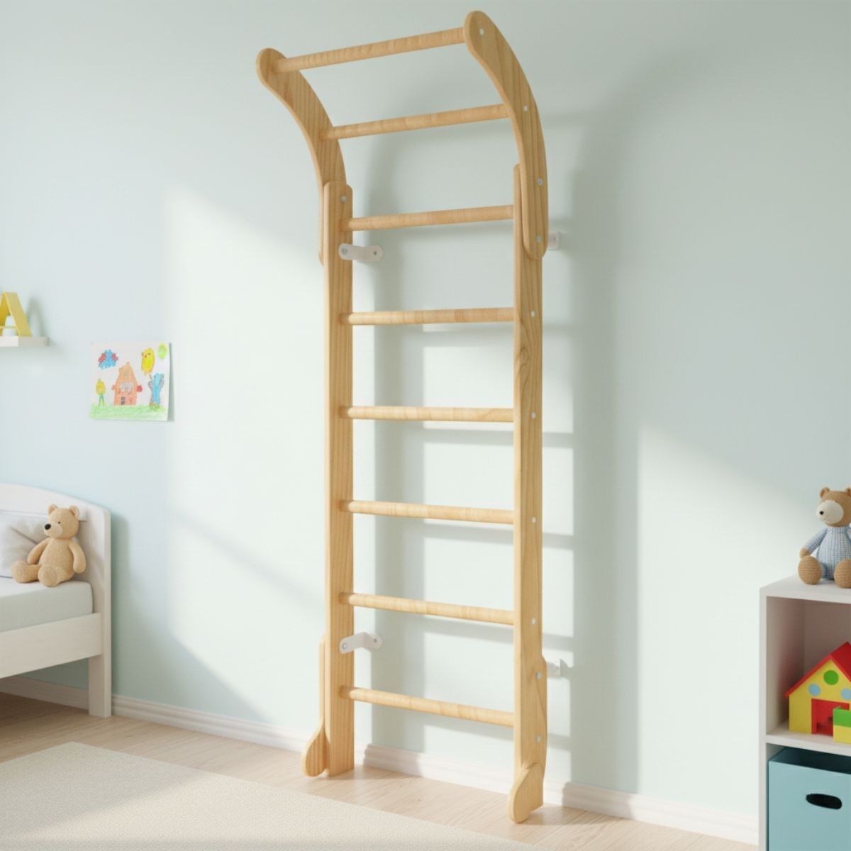 The Wooden Wall Bars Mini are a classic piece of home sports equipment designed especially for children. Made entirely of high-quality wood, this Swedish ladder is both functional and aesthetic — its smooth, warm surface and natural look blend beautifully into any interior without disrupting home comfort.