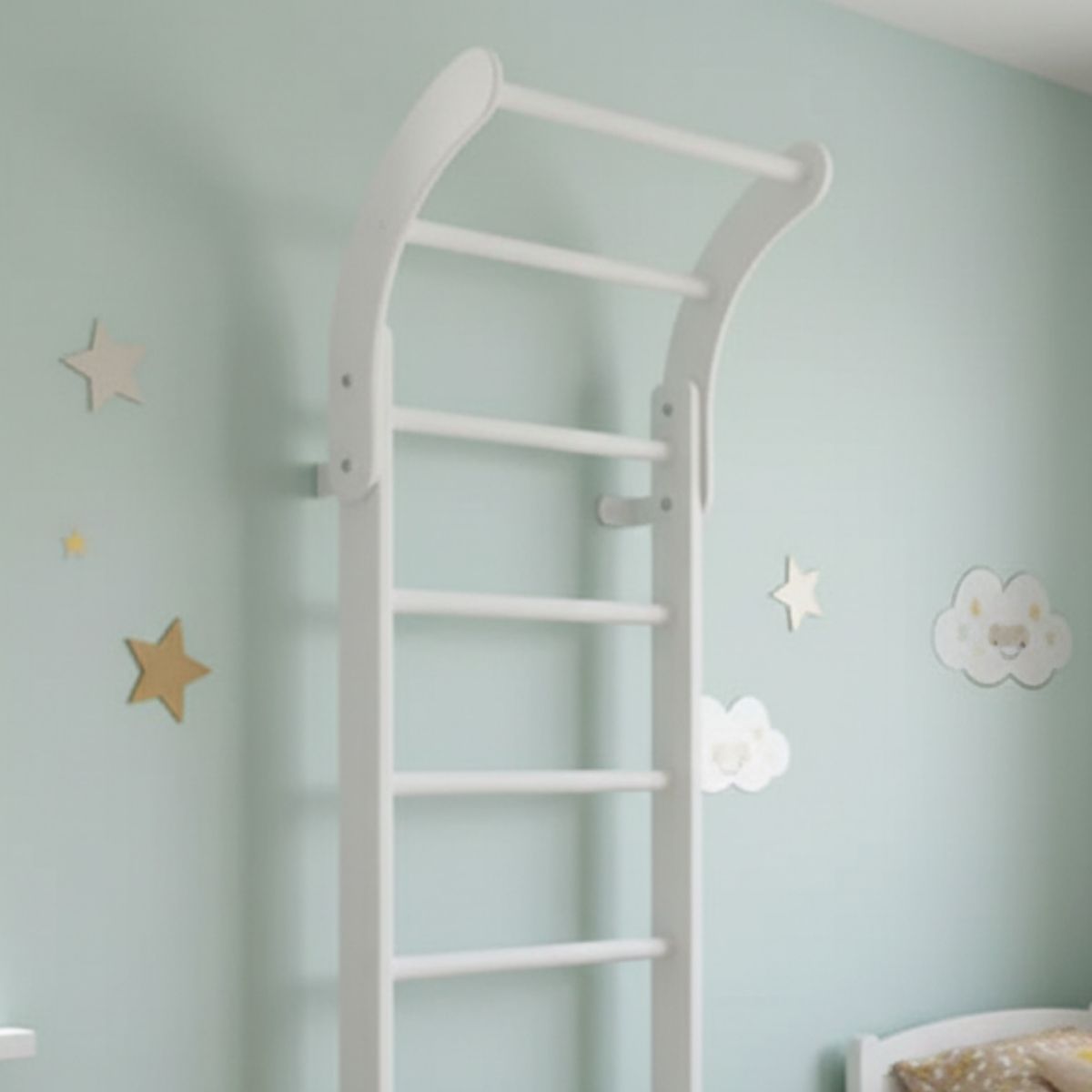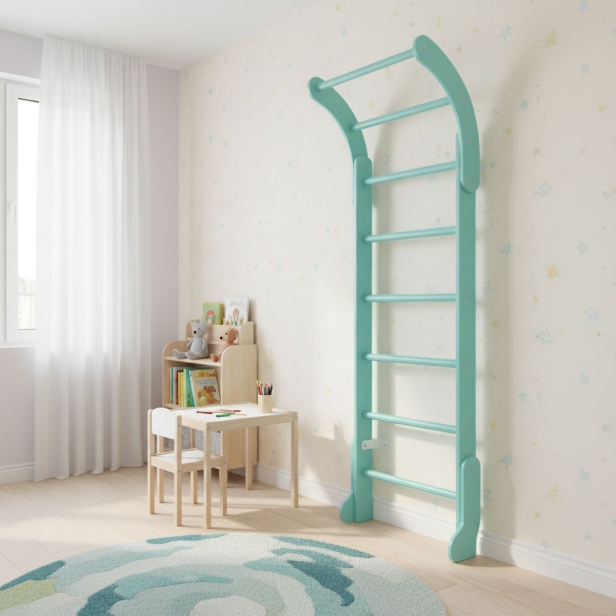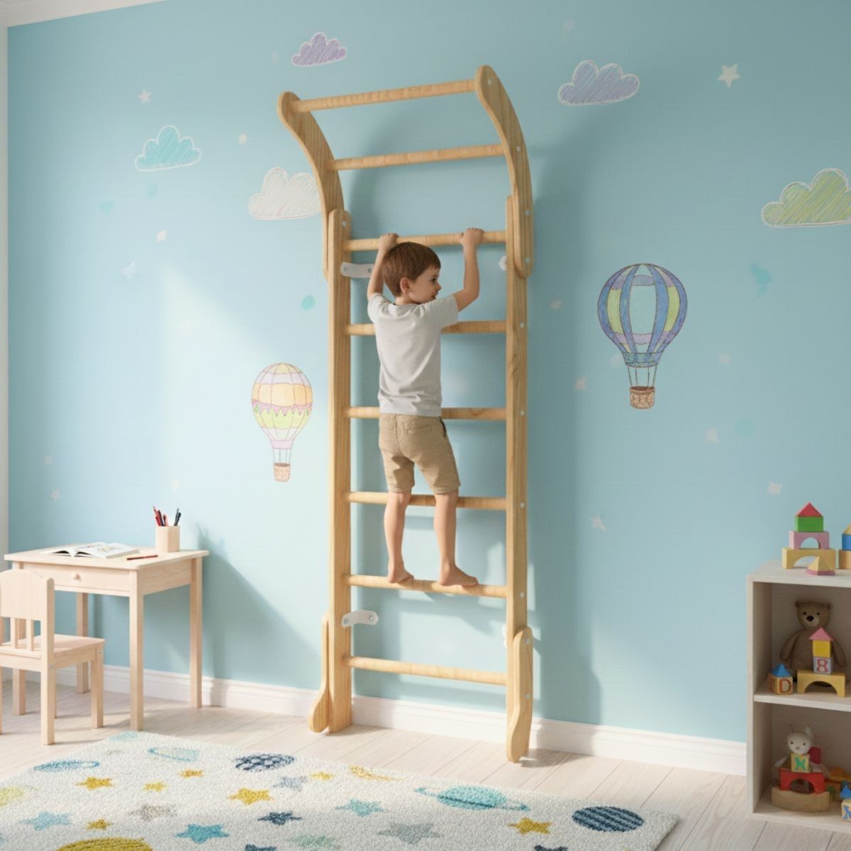 The Wooden Wall Bars Mini are a classic piece of home sports equipment designed especially for children. Made entirely of high-quality wood, this Swedish ladder is both functional and aesthetic — its smooth, warm surface and natural look blend beautifully into any interior without disrupting home comfort.