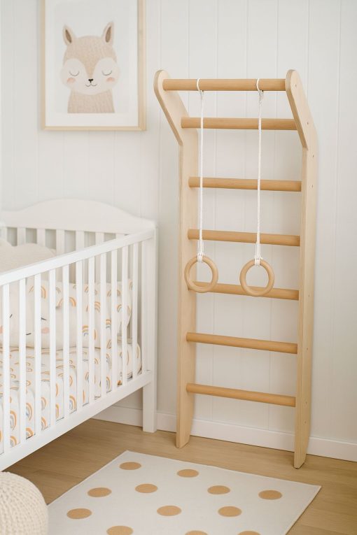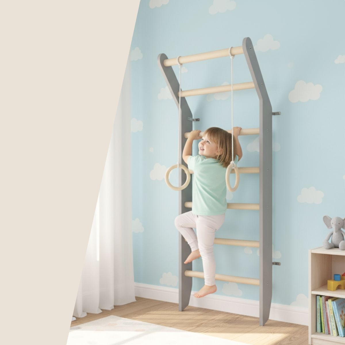 The Toddler wooden wall bars are a classic gymnastic ladder specially designed for the youngest children. Made of smooth, natural wood, this compact set is safe, durable, and perfectly suited for early physical development and play.
