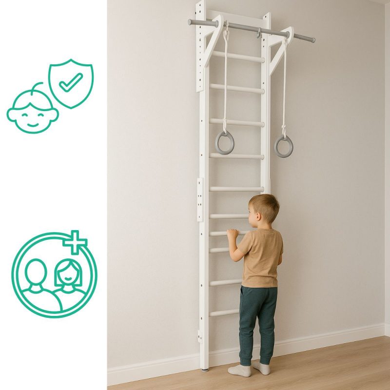 Wooden wall bars, also known as wooden stall bars or wooden Swedish walls, are a classic piece of gym equipment suitable for both children and adults. Made from natural wood, these gymnastics wall bars combine durability with an aesthetic design that easily fits into any interior.
